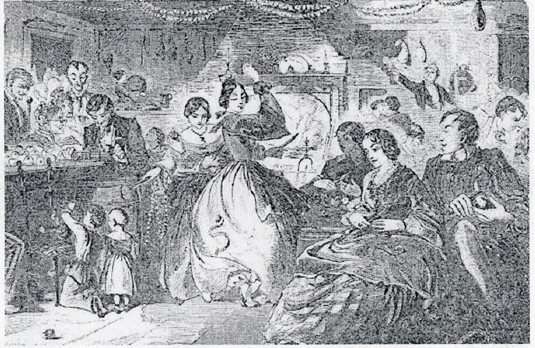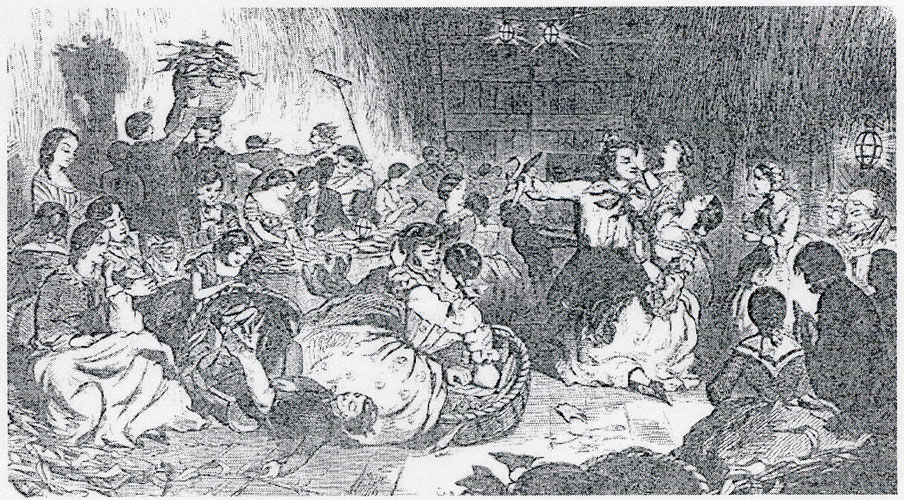 In the days of colonial settlement through the years of the early republic, dancing was the "principal and foremost amusement" in both city and country. Barn dances played a significant role in the social life of rural Vermonters, most commonly serving as the high-spirited conclusion to the "bee." This popular combination of work and play grew out of Vermont settlers' desire to help friends and neighbors in their communities with large scale tasks such as logging, house and barn raising, corn husking, apple paring and, later in the 19th century, harvesting hops. Husks or apple parings were cleared from barn floors to allow young and old to join in lively country dances and general frolicking. This now centuries-old tradition and variations such as kitchen junkets, were captured in engravings by 19th century artists, such as The Apple-Bee (above, 1859) and Husking the Corn in New England (right, 1858) by Winslow Homer , played no small part in the lives of early Vermonters.