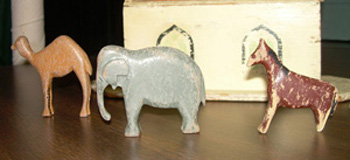 The materials, which were made in England are made of painted pine and consist of Noah and Mrs. Noah, 8 mammals, and 1 bird. Pieces from a Noah's Arc toy collection. It was sometimes the only toys that children were allowed to play with on Sundays because of its religious significance.